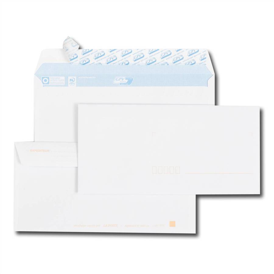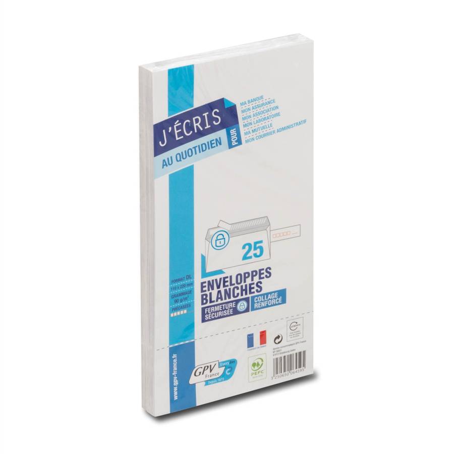 Paquet de 25 enveloppes blanches GPV Format DL : 110x220 90 g/m² Enveloppes précasées avec bande de protection
