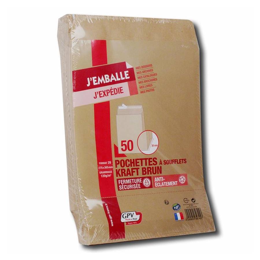 Paquet de 50 sacs à soufflets kraft brun 26 280x375 120 g/m² bande de protection
