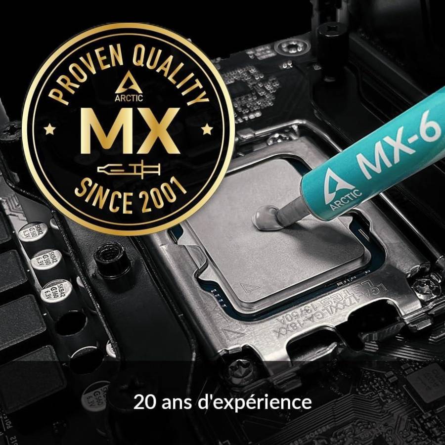 Voir plusDES PERFORMANCES AMÉLIORÉES DE 20 %: Grâce à sa composition améliorée, la pâte ARCTIC MX-6 présente une résistance thermique nettement inférieure à celle de la MX-4 UNE QUALITÉ PROUVÉE: Avec plus de 20 ans d'expérience sur le marché du refroidissement des PC, nous nous sommes focalisés sur l'amélioration des performances, la polyvalence des applications et avons misé sur une consistance facile à utiliser UNE APPLICATION SANS AUCUN RISQUE: La pâte thermique MX-6 n'est ni conductrice d'électricité ni capacitive. Cela élimine le risque de courts-circuits ou de décharges APPLICATION POLYVALENTE: Avec sa nouvelle composition, la MX-6 est la pâte thermique appropriée pour de nombreuses applications. Grâce à sa viscosité, notre pâte thermique convient également aux scénarios de refroidissement direct des GPU des cartes graphiques et des processeurs de consoles de jeux