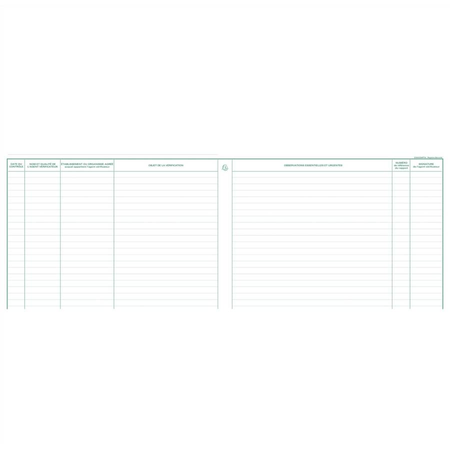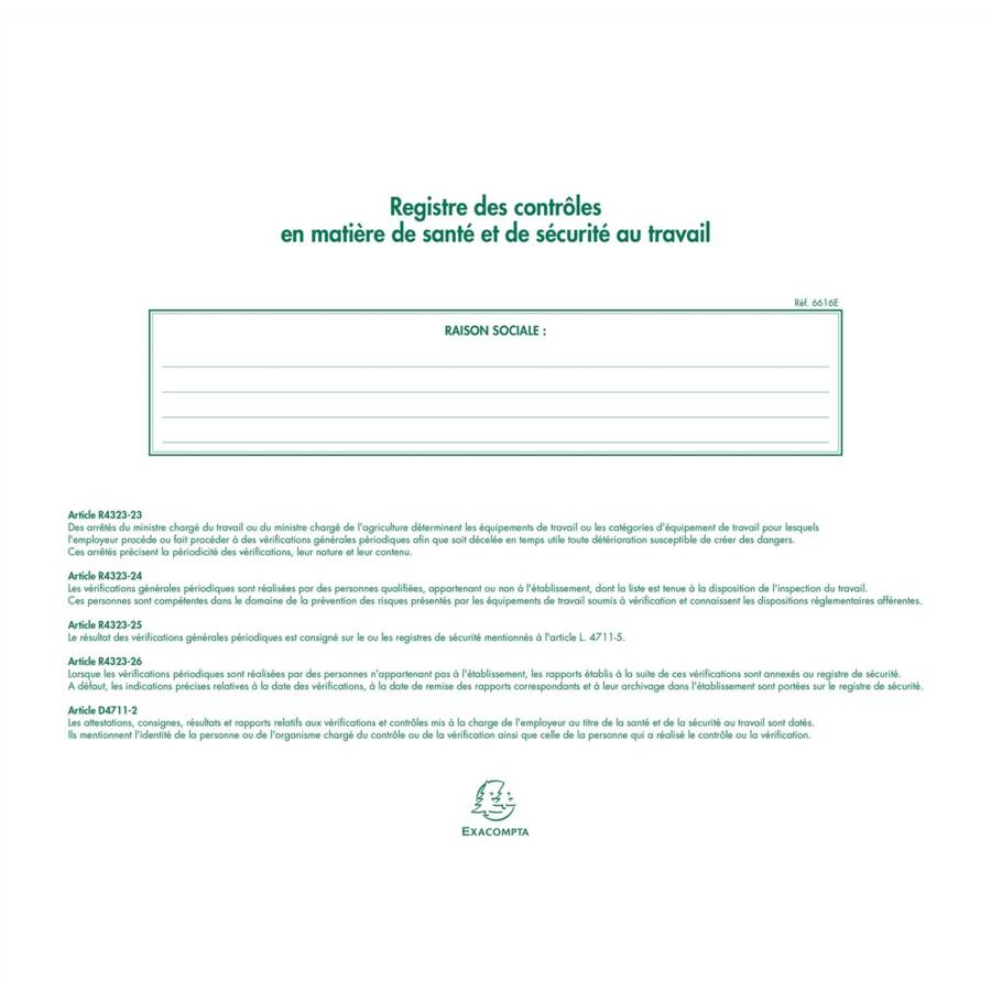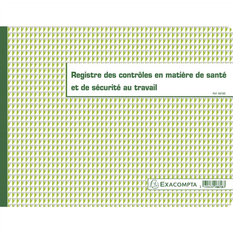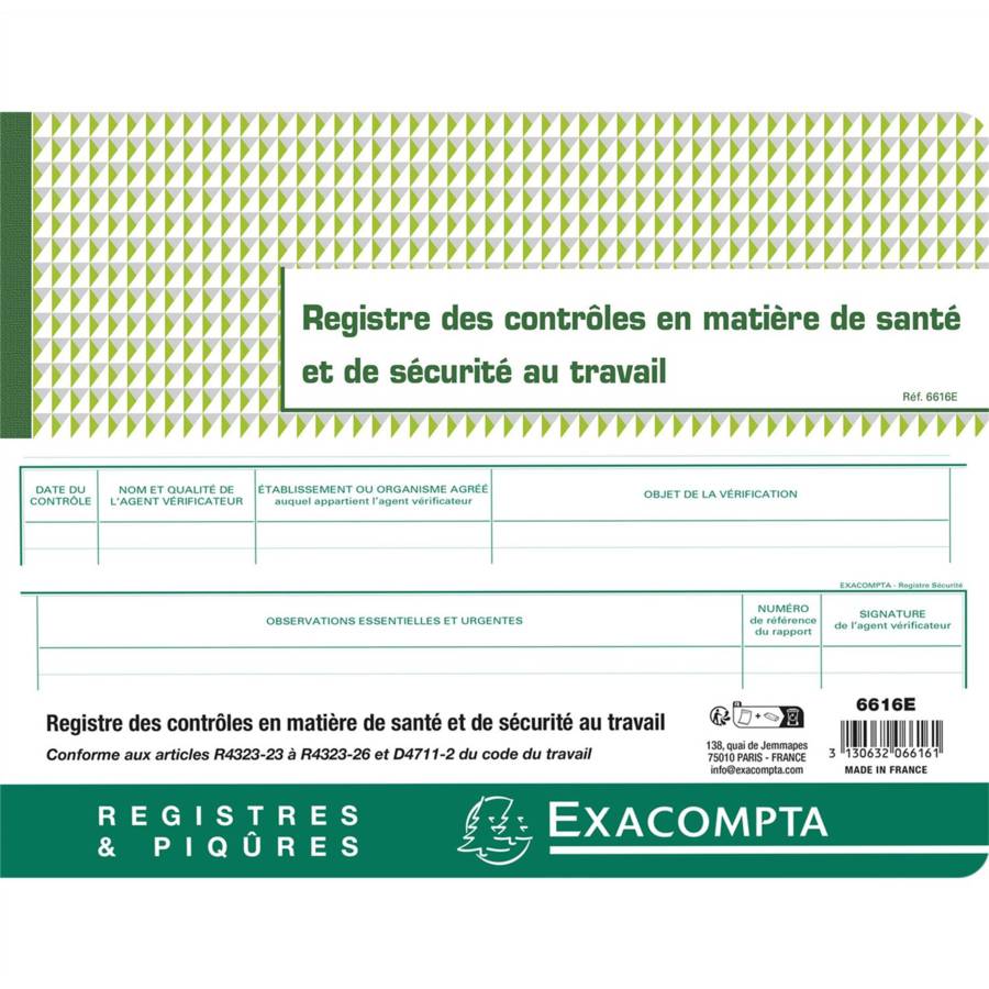 Piqûre 24x32cm - Registre des contrôles de santé et de sécurité au travail - 20 pages Permet de répertorier les vérifications périodiques obligatoires réalisées sur les équipements de l'entreprise (date du contrôle, objet de la vérification, observations, ... ) La clarté des tracés Exacompta et leur qualité d'impression avec une encre verte spéciale (exclusivité de fabrication) sont reconnues et appréciées depuis des années. Papier 110 g/m2 légèrement teinté, spécialement étudié pour reposer la vue, et mat pour une écriture facile et nette. Fabrication 100% française.