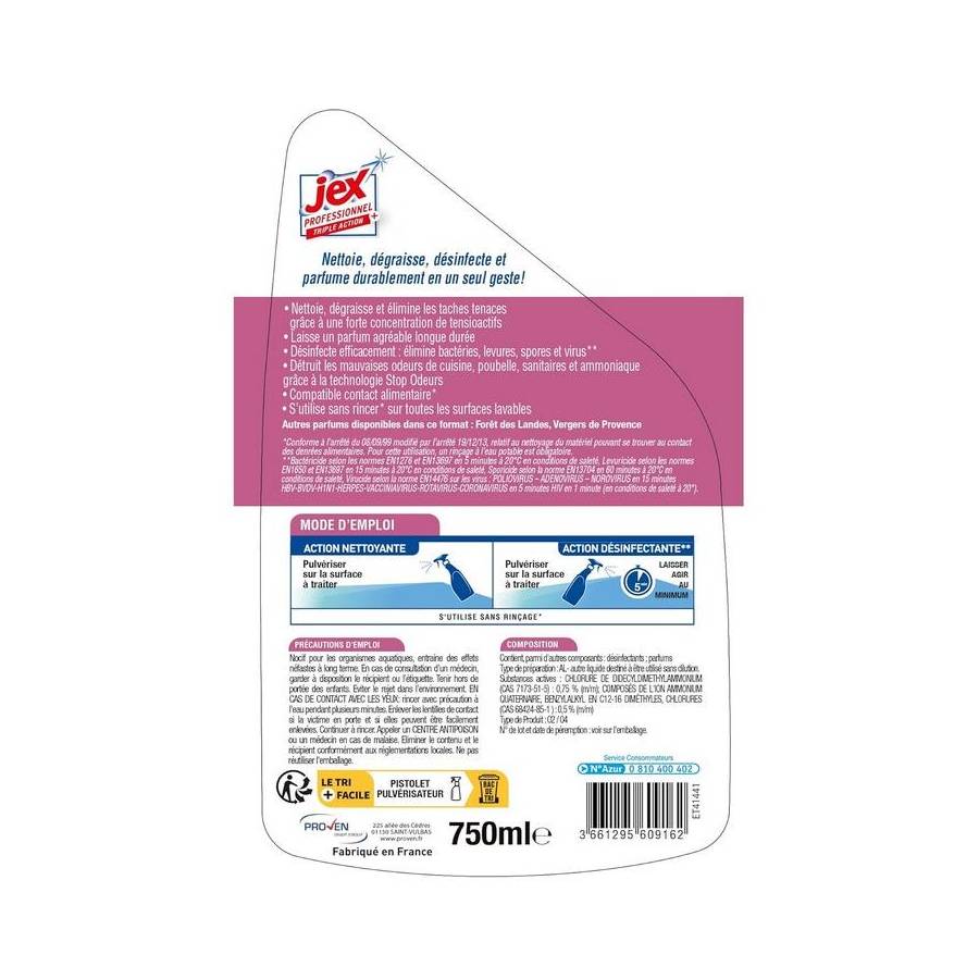 Voir pluspistolet 750 ml Jex Professionnel Triple Action prêt à l'emploi Souffle d'Asie 4 en 1 : Nettoie, désinfecte, dégraisse et parfume durablement. Détruit les mauvaises odeurs Technologie Stop Odeurs 4 en 1 : Nettoie, désinfecte, dégraisse et parfume durablement Détruit les mauvaises odeurs de cuisines, poubelles, sanitaires, ammoniaque grâce à la technologie stop Odeurs. Capacité désinfectante renforcée : bactéricide, levuricide, virucide Bactéricide selon les normes EN1276 et EN 13697 en 5 minutes en conditions de saleté Levuricide selon les normes EN1650 et EN13697 en 15 minutes en conditions de saleté Sporicide selon la norme EN13704 en 60 minutes en conditions de saleté Virucide selon la norme EN14476 en 5 minutes en conditions de saleté Contact alimentaire Formule PAE ultra concentré en tensioactifs pour une hygiène irréprochable