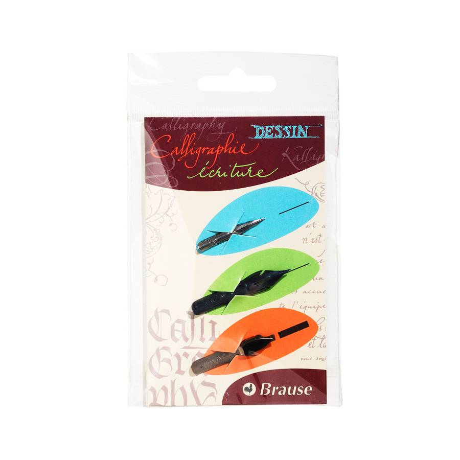 Pochette 3 plumes assortiment La plume de dessin, étonnante de souplesse, vous permettra d'exécuter une anglaise de petite taille La plume sténo, aigue et échancrée en acier bleui, est idéale pour l'anglaise La Bandzug 2,5 mm, à palette et réservoir, rend très facile l'écriture des rondes et donne des lettres gothique incomparables