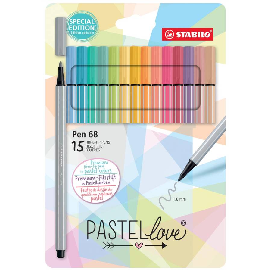 15 feutres STABILO Pen 68 Pastellove Le feutre de dessin STABILO Pen 68 est une référence depuis plus de 50 ans, issu du savoir-faire des Beaux-Arts ! Avec une palette exceptionnelle de 65 couleurs éclatantes, incluant des nuances fluo et pastel, STABILO Pen 68 est le feutre dessin parfait pour tous les créatifs ! Des enfants qui dessinent aux artistes les plus exigeants en passant par les amateurs de nouvelles tendances créatives, chacun y trouvera son compte Grâce à son encre...