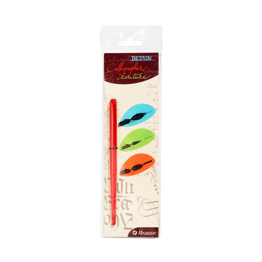Pochette porte-plume+3plumes assorties Porte-plume et assortiment 3 plumes La plume de dessin, étonnante de souplesse, vous permettra d'exécuter une anglaise de petite taille La plume sténo, aïgue et échancrée en acier bleui, est idéale pour l'anglaise La Bandzug 2 mm, à palette et réservoir, rend très facile l'écriture des rondes et donne des lettres gothique incomparables