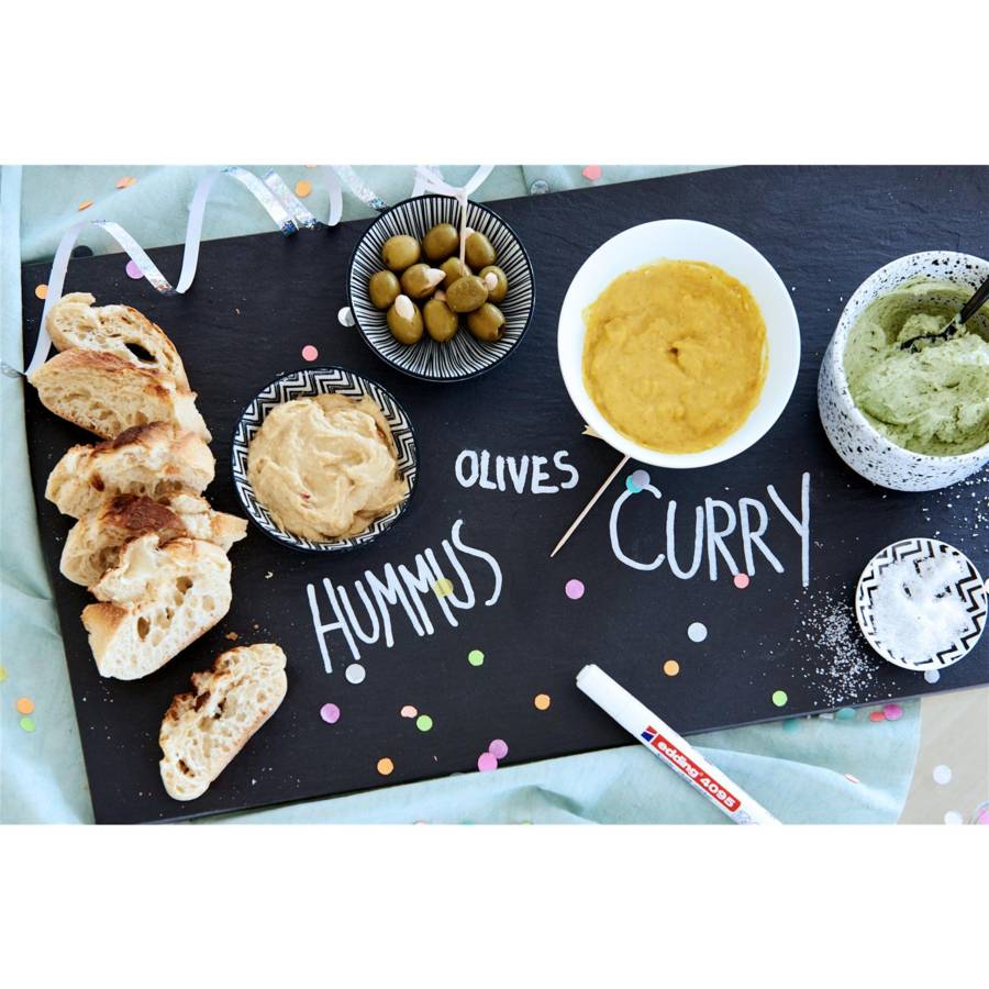 Voir plusLa craie liquide sous forme de marqueur permet un maniement plus aisé que la craie traditionnelle Les marqueurs craie d'edding permettent de réaliser en toute facilité des caractères élégants et professionnels tout en gardant les mains propres. Un choix de 9 couleurs brillantes est proposé : le blanc, le jaune fluo, l'orange fluo et le rose fluo resplendissent sous la lumière UV La largeur d'écriture moyenne convient pour les inscriptions et les dessins créatifs Le marqueur craie liquide edding est un instrument très prisé des restaurants, des commerces de détail et des concessionnaires automobiles Partout où il faut des inscriptions réalisées avec précision A la maison, on pourra aussi décorer, par exemple, des fenêtres pour n'importe quelle saison ou occasion. La surface pourra être décorée à main levée ou à l'aide d'un modèle. Dans ce dernier cas, coller le modèle derrière la vitre, puis repasser sur le dessin dans la couleur voulue. Le site Internet d'edding propose une multitude de pochoirs à télécharger Secouer le marqueur avec le capuchon fermé, retirer le capuchon, pomper le marqueur pointe vers le bas, par exemple sur un morceau de papier brouillon, pomper avec précaution jusqu'à ce que l'encre remplisse la pointe. Le marqueur est maintenant prêt à l'emploi. Il ne faut pas trop pomper sur la pointe pour éviter de former des gouttelettes sur les lettres. Si on doit corriger, il suffit d'effacer l'encre avec un chiffon humide Pour les matériaux délicats par exemple le plexiglas, nous recommandons de faire un test au préalable à un endroit peu visible Stocker à l'horizontale Produit de marque haut de gamme Produit fabriqué en Allemagne