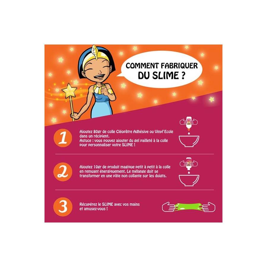 Fabrique ton Slime super facilement à la maison avec le Produit Magique Cléopâtre. Il te suffit de l'ajouter à de la colle Cléopâtre et le tour est joué ! Tu peux même ajouter du gel pailleté pour le personnaliser et le rendre scintillant. Ce liquide magique tout-en-un transforme les colles liquides Cléopâtre Adhésive et Vinyl'Ecole en une pâte Slime élastique et gluante. ? Recette : Ingrédients :... Voir plusProduit Magique à ajouter à la colle Cléopâtre pour faire du Slime.