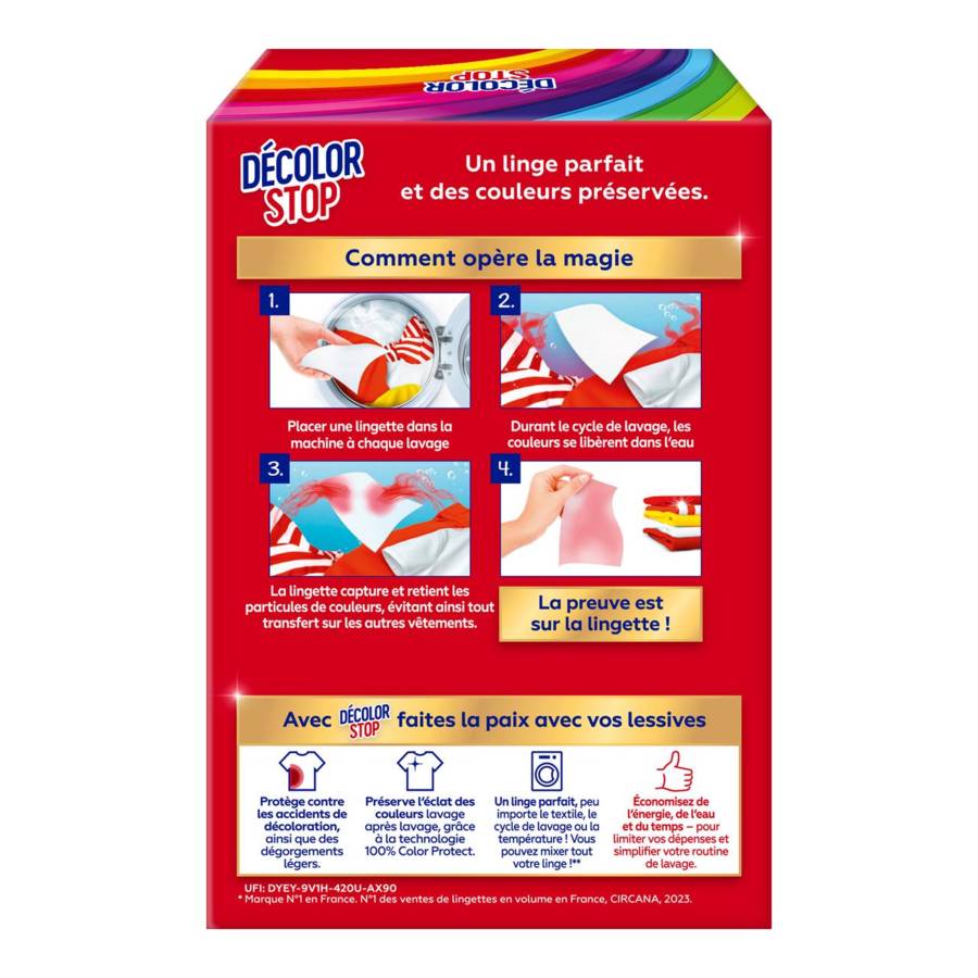 Décolor Stop protège votre linge contre les accidents de décoloration, ainsi que les dégorgements légers. Les couleurs qui dégorgent peuvent ternir les vêtements. La nouvelle gamme de lingettes Décolor Stop préserve l'éclat des couleurs lavage après lavage, grâce à la technologie 100% Color Protect. La preuve est sur la lingette ! Fabriquées à partir de fibres 100% d'origine végétale, ces lingettes anti-décoloration permettent de réduire le nombre de machine et donc d'économiser du temps, de l'eau et de l'énergie !