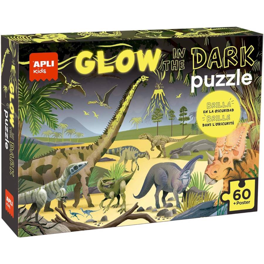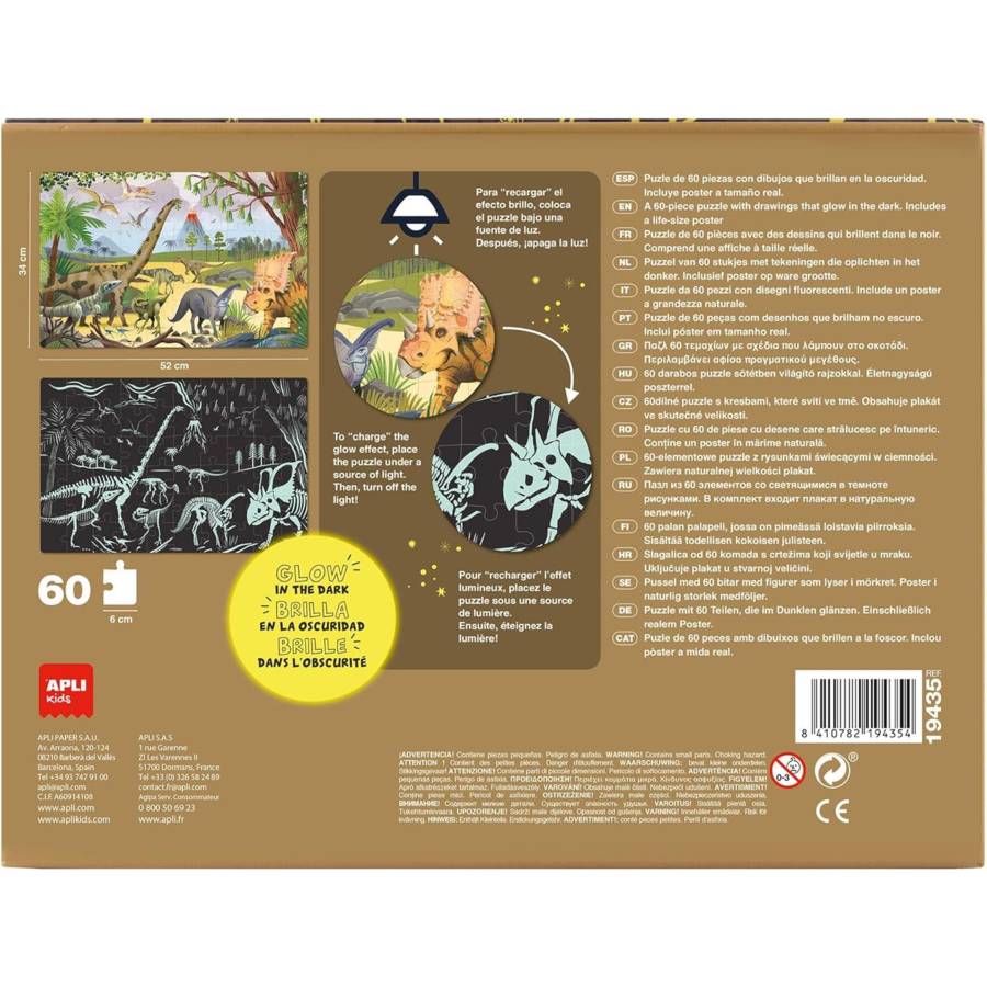 Puzzle pour enfant FLUORESCENT "Glow in the Dark" sur le thème des Dinosaures. Il contient 60 pièces de taille 6 x 6 cm. Une fois assemblé, le puzzle mesure 52 x 34 cm. Il inclut également un poster grandeur nature pour faciliter le montage. Facile à manipuler pour les plus petits : pièces résistantes, sûres et faciles à prendre en main. Construisez le puzzle, et une fois terminé, ÉTEIGNEZ LA LUMIÈRE pour découvrir tous les détails cachés qui brillent dans l'obscurité....