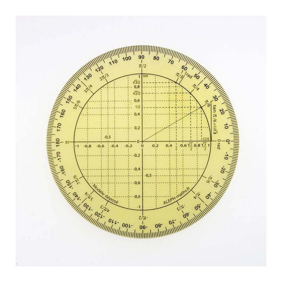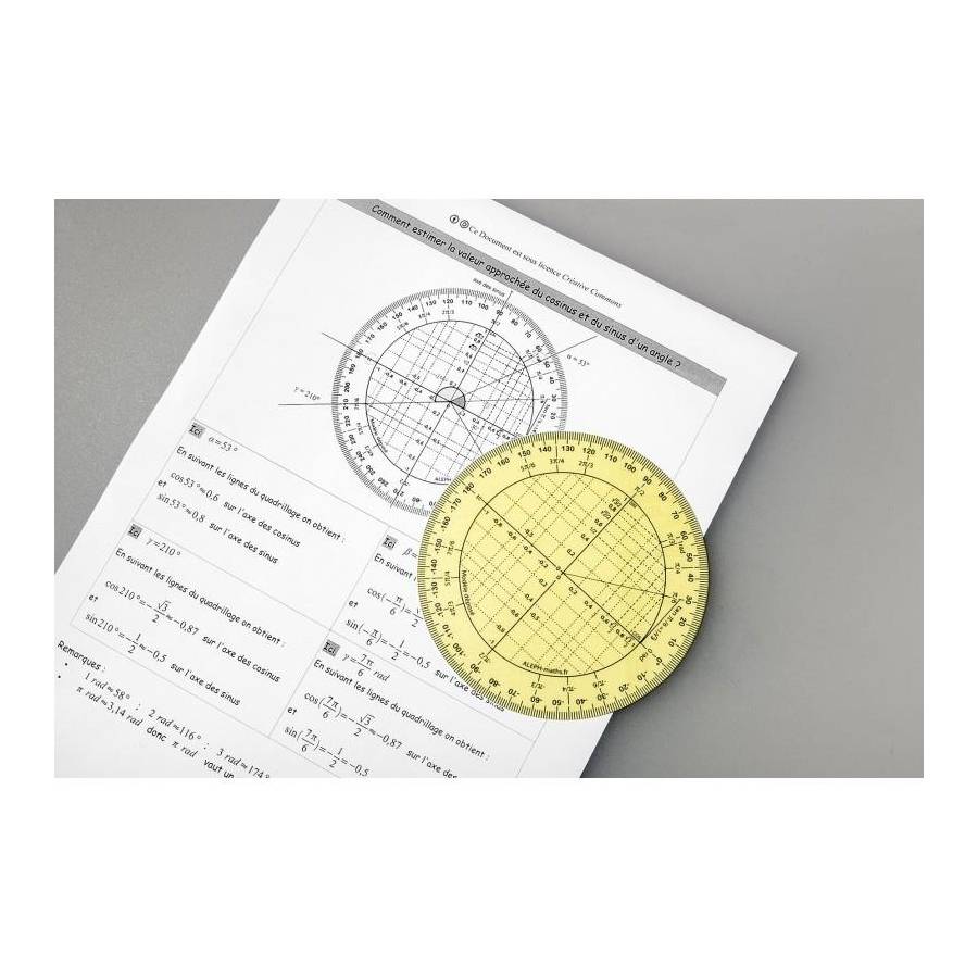 Voir plusRapporteur trigoniométrique Couleur jaune Graduation sur 360° Diamètre de 11 cm Il permet la mesure des angles en degrés et en radians et des cosinus et sinus à 0,05 près.. Autorisé au Baccalauréat Pour les élèves : des instruments en plastique translucide, souple, incassable et inrayable, aux graduations protégées par un verni légèrement teinté. Les outils ont une bonne résistance à l'usure, permettant aux élèves de les conserver plusieurs années. Pour les professeurs : des instruments pour tableau en plexiglas incassable qui peuvent être aimantés. Aleph privilégie la proximité et fait fabriquer ses produits en France, dans le département du Rhône. Aleph a aussi le souci de l'environnement. C'est pourquoi elle a fait réaliser le "Bilan Carbone" de son activité des années 2012 et 2015