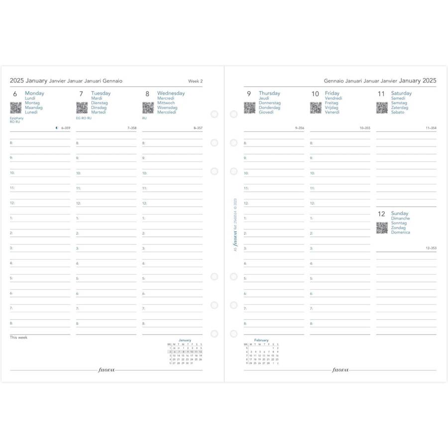 Semaine sur deux pages - multilingue - A5 - 2025 Filofax Recharge pour agenda 2025 A5 Semaine sur deux pages, format colonne avec rendez-vous Dimensions du papier : 148 x 210 mm Téléchargez l'application gratuite Filofax Reminder Utilisez les codes QR pour consulter votre agenda sur votre téléphone