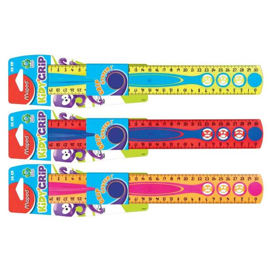 Maped Règle plate Kidy Grip de 300 mm En plastique incassabl et antidérapant Graduation des 2 côtés avec grands chiffres et visages à reproduire Graduation en mm Couleur aléatoir : vert/bleu, orange/rose OU rouge/bleu (pas de choix de couleur possible)