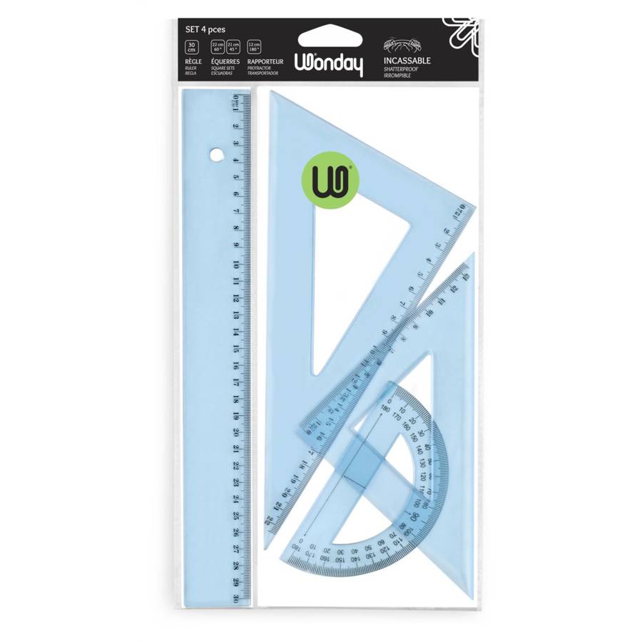 Set de traçage de 4 pièces en plastique incassable : - 1 règle 30 cm avec 1 biseau gradué en mm et bord antitache - 1 équerre : 60° - 22 cm / Grand côté - 1 équerre : 45° - 21 cm / Hypoténuse - 1 rapporteur 180° - 12 cm