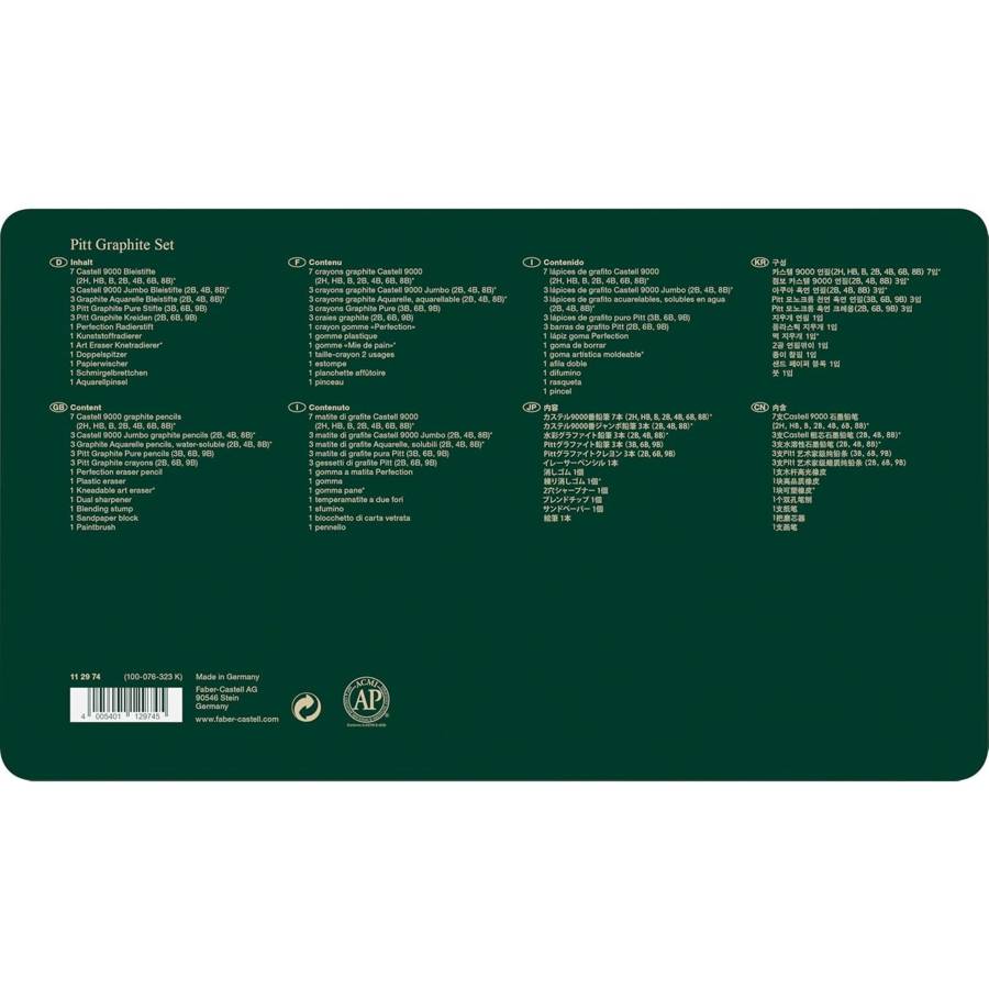Voir plusL'assortiment PITT Monochrome graphite offre à tous les créatifs une grande variété de crayons et de craies dans des duretés différentes, idéales pour les esquisses, les dessins graphiques et de larges surfaces. Le "crayon graphite vert de Faber", dont van Gogh ou Goethe ont déjà parlé en termes élogieux, est de nos jours un compagnon indispensable au quotidien. Les 16 degrés de dureté vont d'un ton gris tendre à un noir graphite foncé et offrent ainsi beaucoup de possibilités de variation à l'artiste. Les crayons PITT graphite pur sont idéals pour créer des contrastes et pour ombrer de grandes surfaces. Selon la pression sur le crayon et la dureté, les crayons graphite pur offrent une expression spontanée inégalée. Les craies graphite PITT sont un outil idéal et très économique pour créer de grandes esquisses et surfaces. - Etui en métal adapté aux besoins professionnels - Assortiment choisi duFaber Castell 9000 dans les degrés de dureté 2H, HB, B, 2B, 4B, 6B et8B, Castell 9000 Jumbo et de crayons graphite aquarelle dans les degrésde dureté 2B, 4B, et 8B, de crayons Pitt Graphite Pure dans les degrésde dureté 3B, 6B, 9B, de craies graphite Pitt dans des degrés de dureté2B et 6B et 9B - Accessoires compris - Idéal pour le voyage