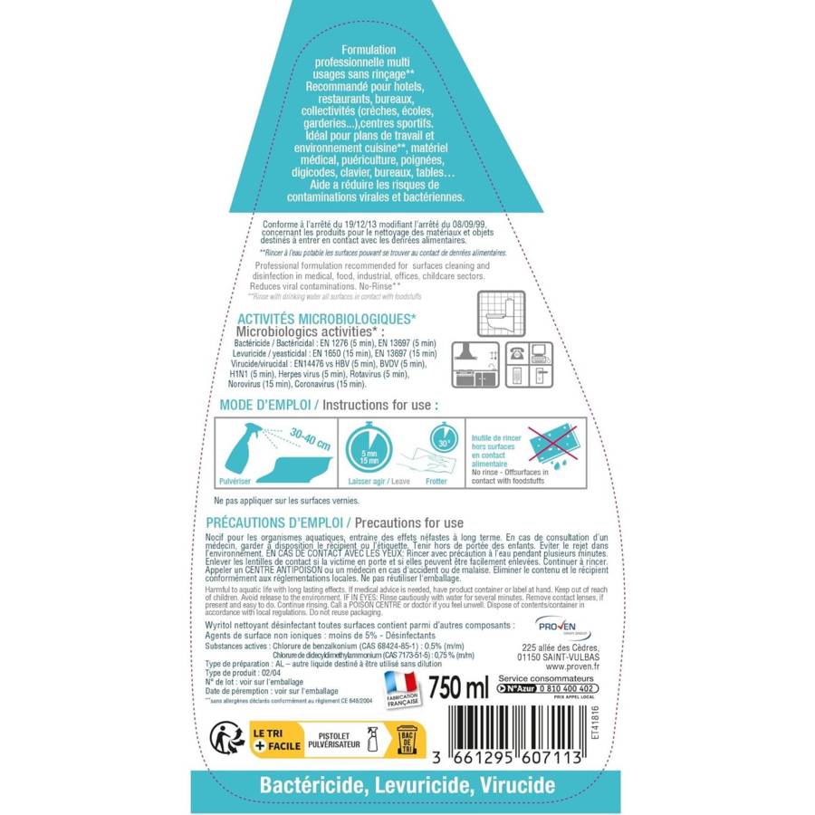 WYRITOL Spray nettoyant désinfectant 750 ml Formulation professionnelle multi-usages sans rinçage*. Nettoie et désinfecte toutes les surfaces. Idéal pour plans de travail et environnement de cuisine*, matériel médical, puériculture, poignées, digicodes, claviers, bureaux, tables… Aide à réduire les risques de contaminations virales et bactériennes. * Rincer à l'eau potable les surfaces pouvant se trouver au contact de denrées alimentaires Les +: Idéal pour les collectivités...