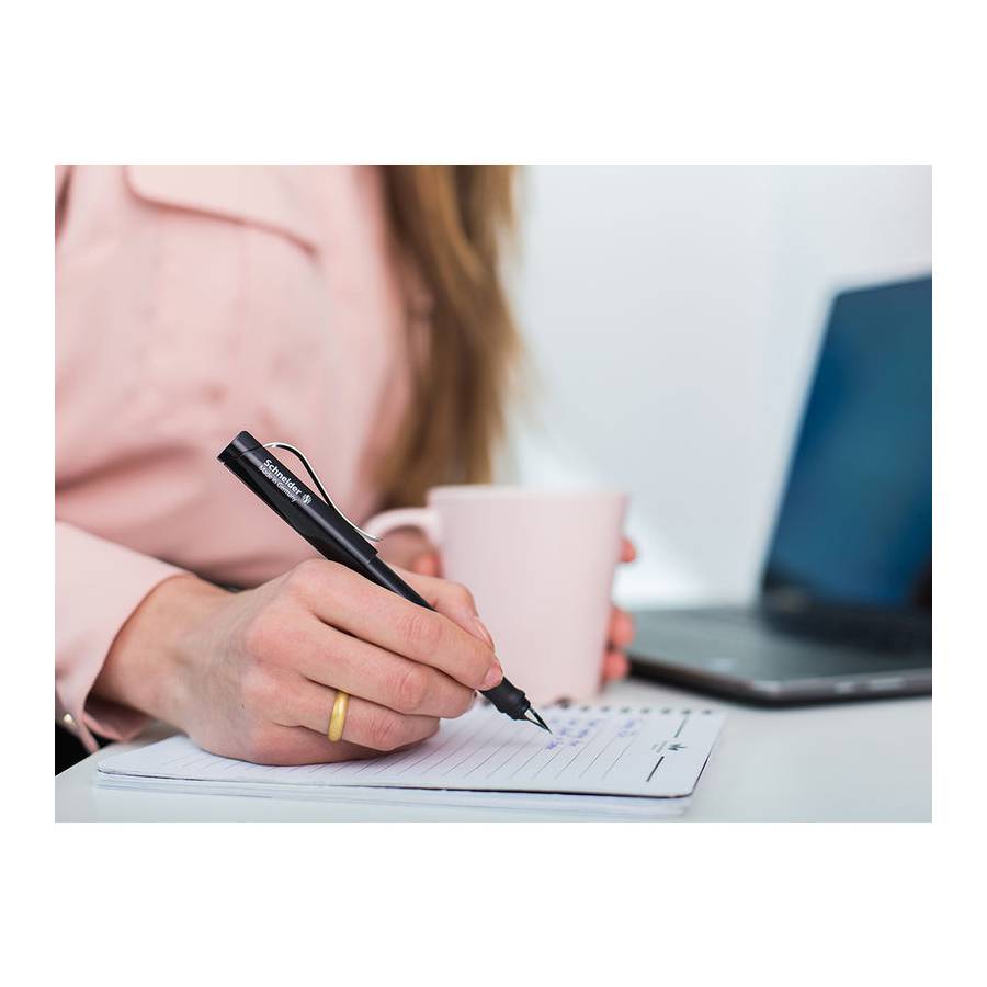 Stylo à plume avec grip ergonomique caoutchouté et plume moyenne (M) en acier inoxydable de haute qualité à pointe iridium. Couleur "noir". Le clip en métal robuste chromé brillant.