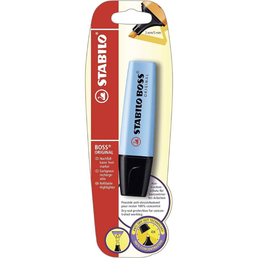 Blister de 1 Surligneur BOSS ORIGINAL Rechargeable Pointe Biseautée 2-5 mm - Bleu Toujours imité, jamais égalé, depuis 1971 le seul surligneur disponible en 9 couleurs attrayantes Encre universelle à base d'eau Résistance intense à la lumière sur tous papiers : normal, fax et autocopiant Procédé anti-dessèchement pour rester 100% concentré : peut rester ouvert jusqu'à 4 heures sans sécher Fluorescence intense du début à la fin 2 largeurs de traits : de 2 à 5 mm Jusqu'à 350 mètres de surlignage Surligneur rechargeable