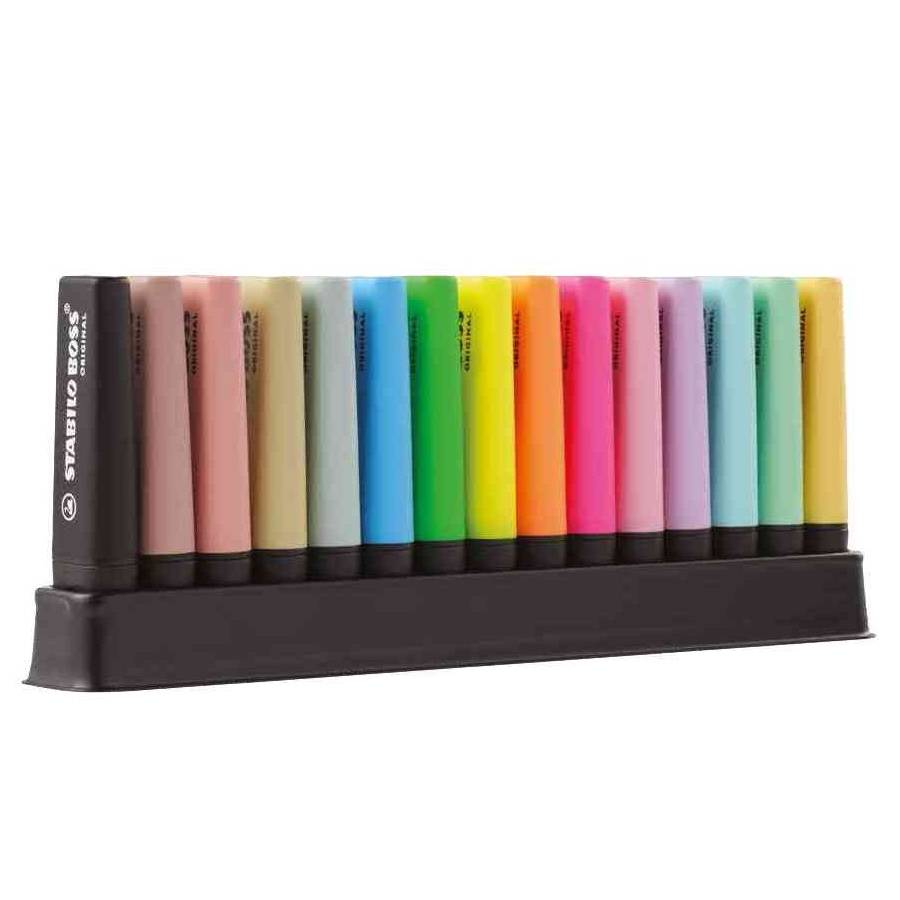 Surligneur BOSS® ORIGINAL - set de table de 15 Le surligneur de référence désormais dans un set de table de 15 avec des couleurs vives, pastel et naturelles • encre rechargeable à base d''eau • pointe biseautée • pour le papier, les photocopies et les fax • peut rester ouvert jusqu''à 4 heures sans sécher • set de table de 15 : assorti dans les couleurs : jaune poudré, soupçon de vert menthe, turquoise délicat, touche de lilas, rouge rosé, rose, orange, jaune, vert, bleu, vert terre, terre d''ombre, terre de Sienne, beige et noir Exemples d''utilisation : - sa capacité à rester longtemps ouvert sans sécher en fait l''outil idéal pour lire et apprendre sans se déconcentrer