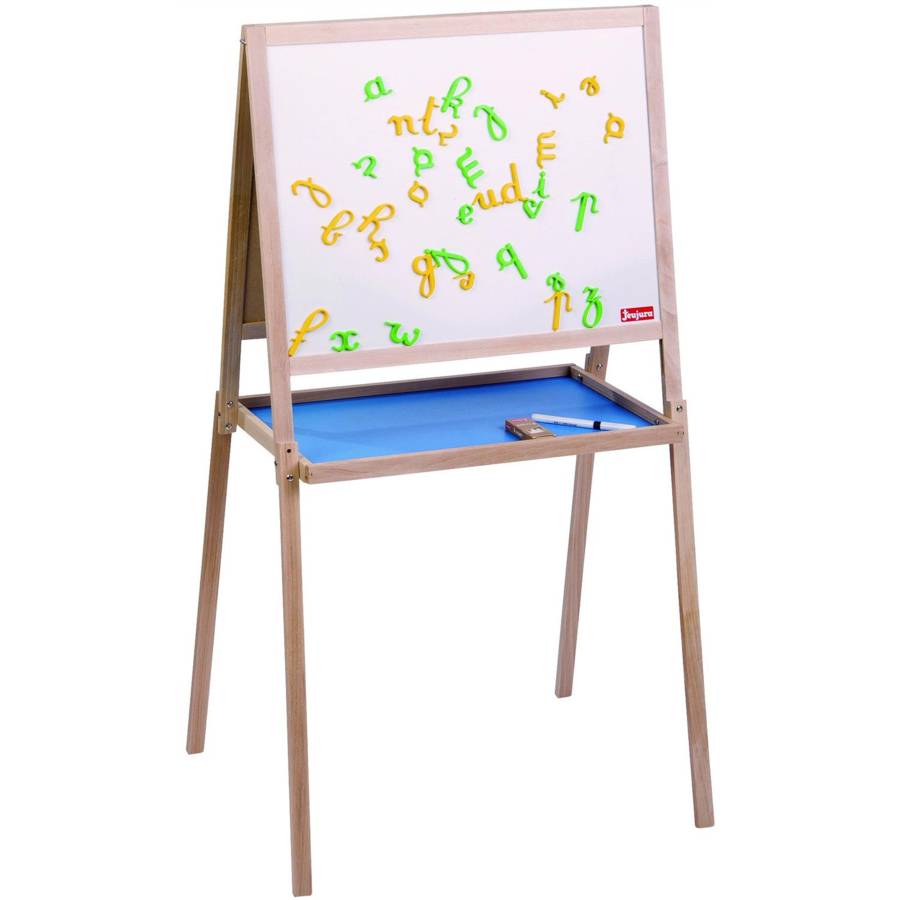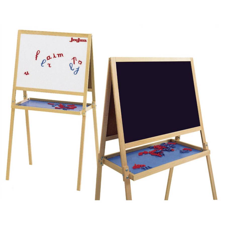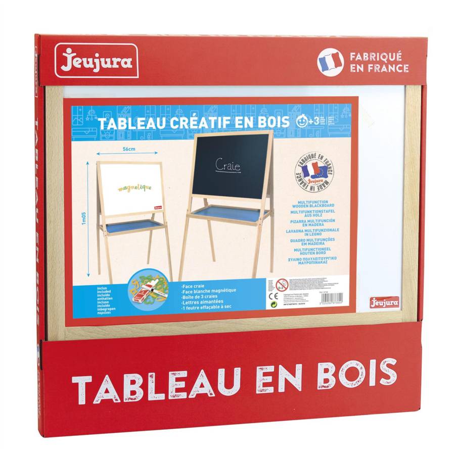 TABLEAU CREATIF EN BOIS : Une face craie, une face blanche magnétique pour feutre. Avec lettres aimantées, craies, feutre. Pieds démontables. Hauteur 105 cm. Ardoise 56x43 cm. Dès 3 ans.