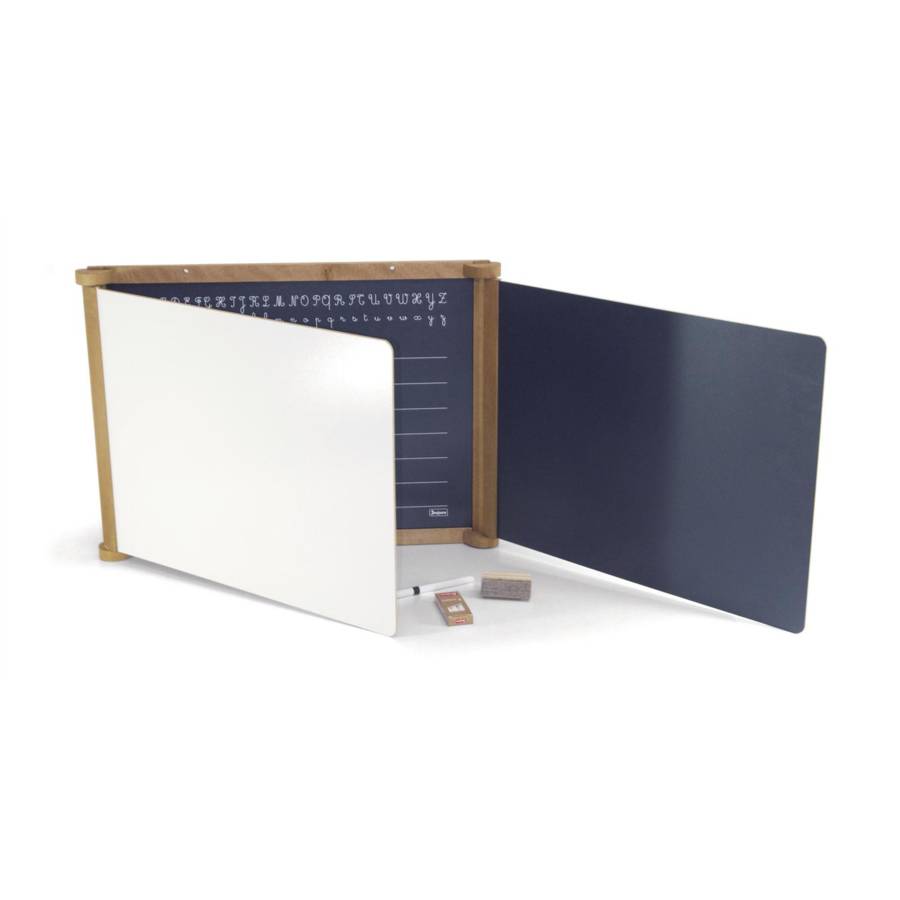 TABLEAU TRIPTYQUE MURAL EN BOIS TEINTÉ CHÊNE : Ardoise centrale sérigraphiée et 2 volets avec une face craie et une face blanche. Plumier bois, craies, feutre, brosse à tableau. Dim. ouvert 156 x 43 cm, fermé 56 x 43 cm. Dès 3 ans.**