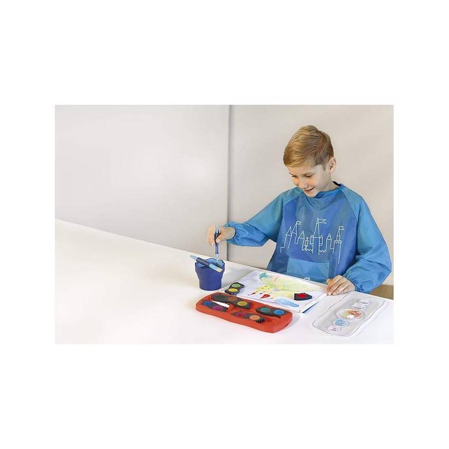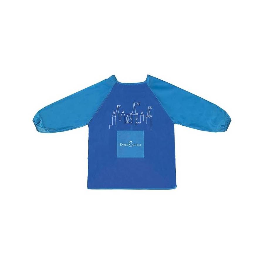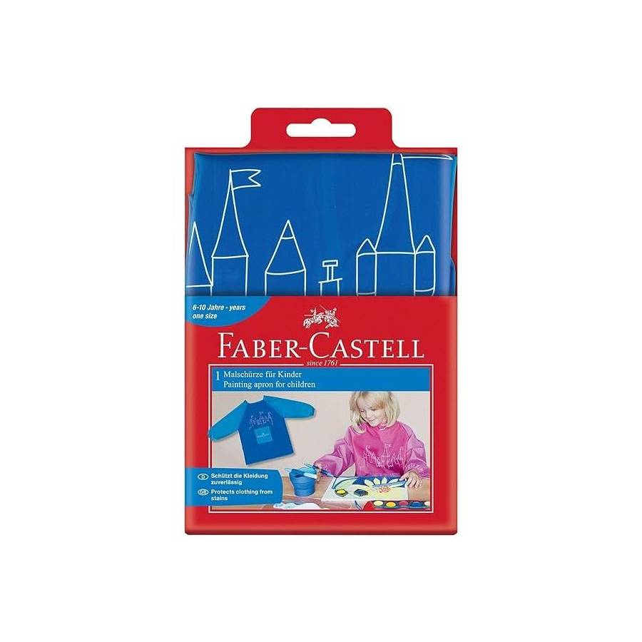 FABER-CASTELL Tablier de peinture pour enfants 100 % polyester Avec de longues manches Petite poche à l'avant Taille unique Bandelettes élastiques sur les manches permettent d'ajuster la taille Porter et enlever facilement grâce à la fermeture auto-agrippante au dos Porte-nom et attache pratique Lavable à 30° C