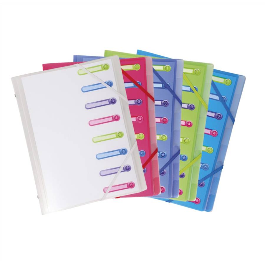 TRIEUR Chromaline avec 3 rabats permettant de stocker des feuilles volantes - capacité de classement complémentaire - En polypropylène translucide aux couleurs douces et tendance COUVERTURE : en polypropylène 5/10ème - intérieur en polypropylène translucide - pochette A4 en 2ème de couverture FERMETURE : par élastiques FENÊTRES découpées permettant d'identifier facilement les compartiments translucides NOMBRE DE COMPARTIMENTS : 8 - capacité jusqu'à 350 feuillets de 80 g COULEURS ALEATOIRES : bleu, incolore, rouge, turquoise, vert